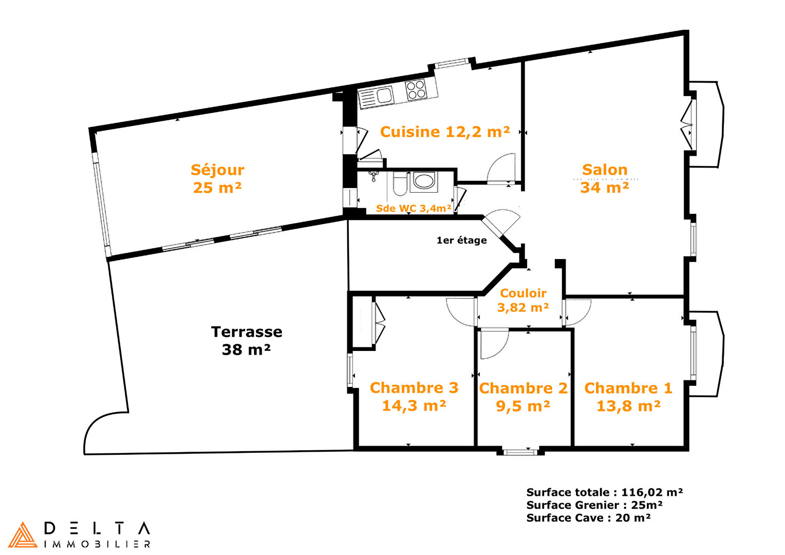 Delta Immobilier vous propose en exclusivité ce grand appartement de 116 m², situé au 1er étage d’une petite copropriété de seulement deux logements.