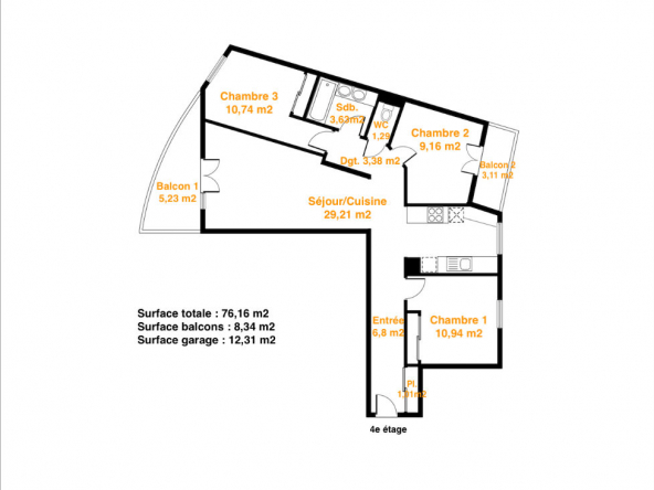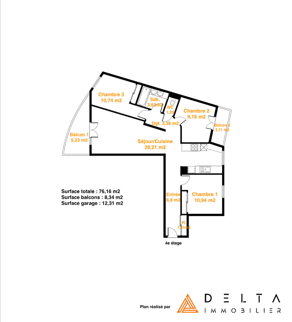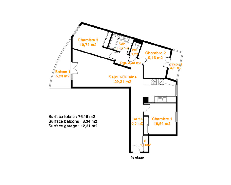 Il se compose d’une entrée avec placards desservant une pièce de vie de 29 m2 avec une cuisine équipée (lave vaisselle, four, hotte, plaque vitrocéramique, micro-ondes) de la marque Cuisinella donnant sur un balcon de 5m2, trois chambres dont deux de plus de 10m2 avec placards et une de 9,16m2 avec son balcon, une salle de bains et un WC séparé.
