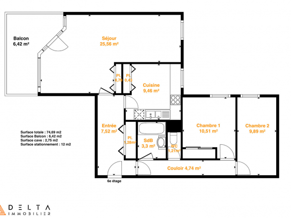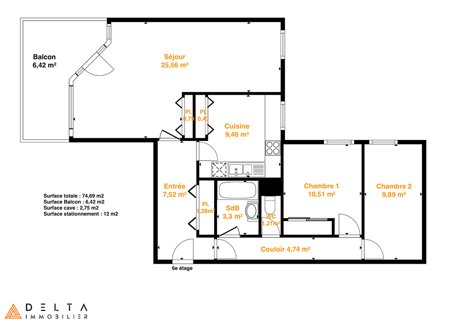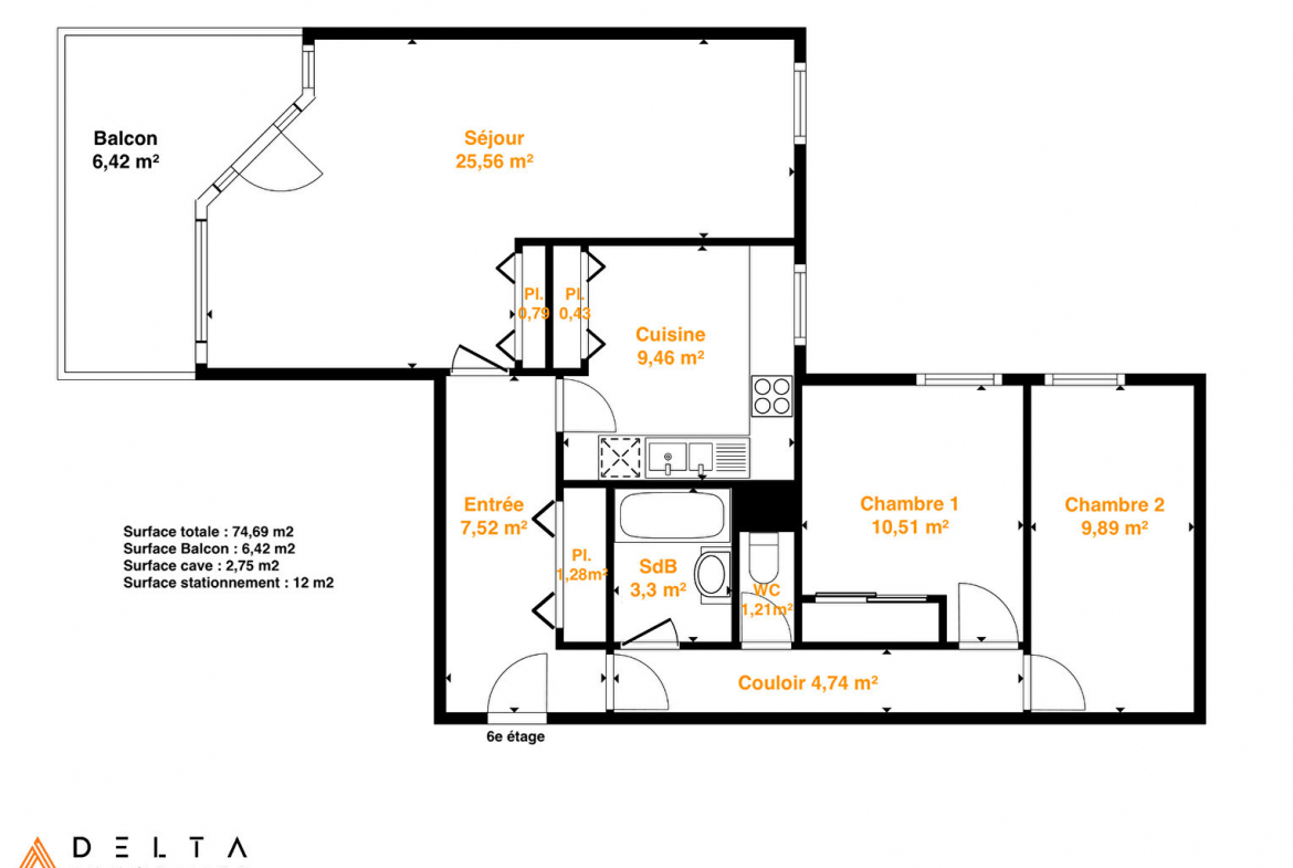 Delta Immobilier vous propose en exclusivité ce grand T3 de 75 m2 situé au 6e et avant-dernier étage avec ascenseur d’un immeuble datant de 1977.